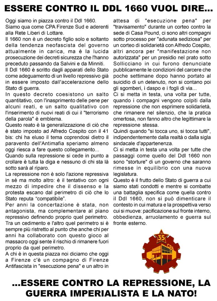 Questo è il frutto dello Stato di guerra a cui siamo stati condotti e mentre si combatte una battaglia specifica come quella contro il Ddl 1660, non si può dimenticare il contesto in cui matura e la prospettiva verso cui si muove: pacificazione sul fronte interno, obbedienza, arruolamento e guerra sul fronte esterno.