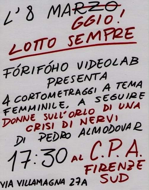 CPA Fi-Sud e ForiFoco videolab presentano sabato 8 maggio dalle ore 17:30 la proiezione di quattro cortometraggi a tema femminile e del film “Donne sull’orlo di una crisi di nervi” di Pedro Almodovar