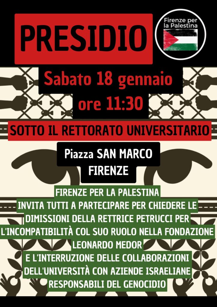 Firenze per la Palestina invita tutti alla mobilitazione del 18 Gennaio contro Leonardo Spa, con un presidio in Piazza San Marco, dove ci riuniremo sotto il rettorato per chiedere le dimissioni della rettrice Petrucci per l’incompatibilità con il suo ruolo nella fondazione Leonardo MedOr.